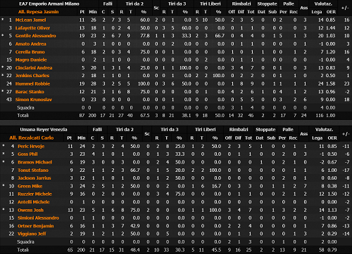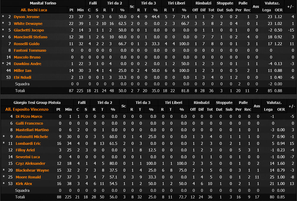 MVP dell’incontro Dewayne White, 19 punti e 25 di valutazione. Molto bene come al solito anche Dyson, Rosselli nel finale e un Mancinelli che sbaglia qualche tiro di troppo ma fa sentire il suo carisma nei momenti che contano. Per Pesaro da salvare il primo tempo di Daye mentre nella seconda parte a turno hanno alternato buone cose Christon, Sheppard e Ceron.