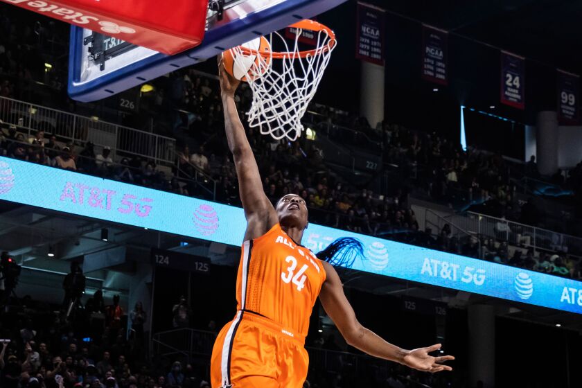 Nel primo quarto, la giocatrice delle Minnesota Lynx ha approfittato di una palla recuperata e di un contropiede uno contro zero per schiacciare a una mano, la seconda schiacciata in carriera nella WNBA per la quattro volte medaglia d’oro olimpica, che già al college a LSU si era esibita al ferro.