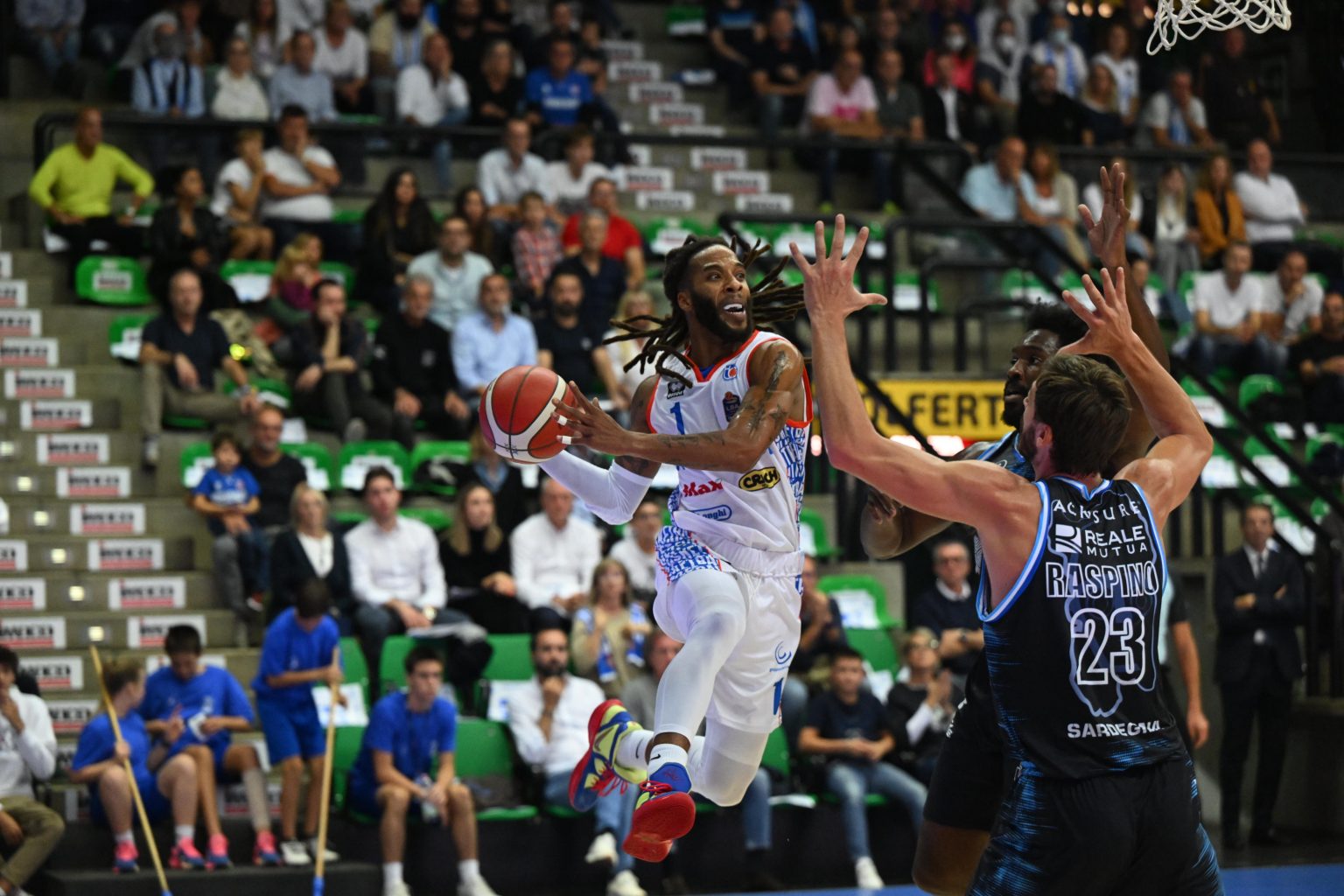 Decisiva la lotta a rimbalzo, in una gara maschia e particolarmente aggressiva: un duello che vede dominare (abbastanza a sorpresa) la compagine trevigiana (40 a 32 il dato a tabellino), a dispetto di un tonnellaggio sotto le plance tutto a favore di una Sassari poco assistita in serata dal duo Diop-Onuaku. Quest’ultimo, in particolare, dopo quanto di buono fatto vedere nelle scorse settimane è risultato, piuttosto lontano dalle fasi salienti del match.