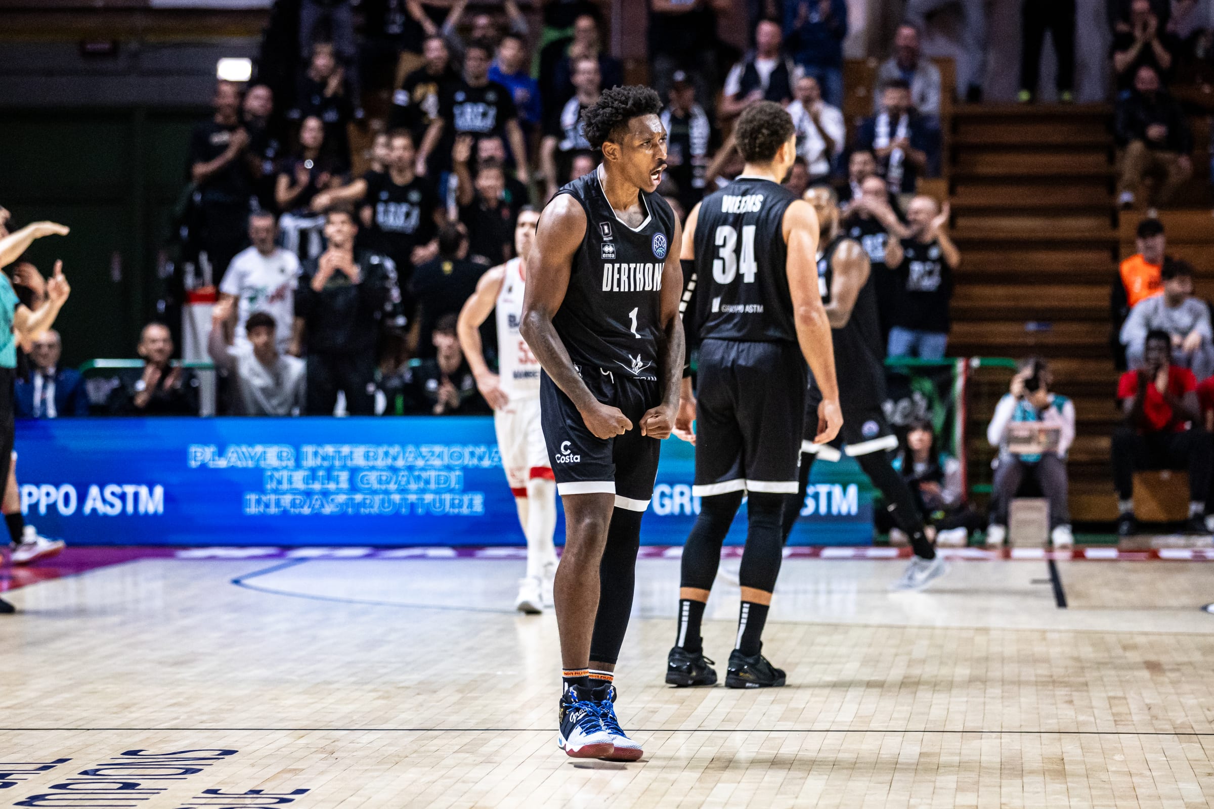 Nonostante le assenze di Shields e Nebo, infortunati nella gara di Eurolega contro il Partizan Belgrado, i padroni di casa approcciano meglio alla partita spinti soprattutto dall’impatto del duo Booker-Leday. Nel secondo periodo l’Olimpia prova a dare la spallata decisiva alla gara ma un parziale di 26 a 2, a cavallo dell’intervallo, porta Tortona sul +15. Nel momento di massima difficoltà, però, la formazione milanese riesce a reagire e, guidata da Guduric, torna a contatto. Il finale è giocato punto a punto, la Bertram mostra più voglia di vincere mentre Milano si deve arrendere alle difficoltà nel tiro da tre punti. Il punteggio finale è 74 a 71 per la formazione di Fioretti che inizia col botto il proprio campionato.