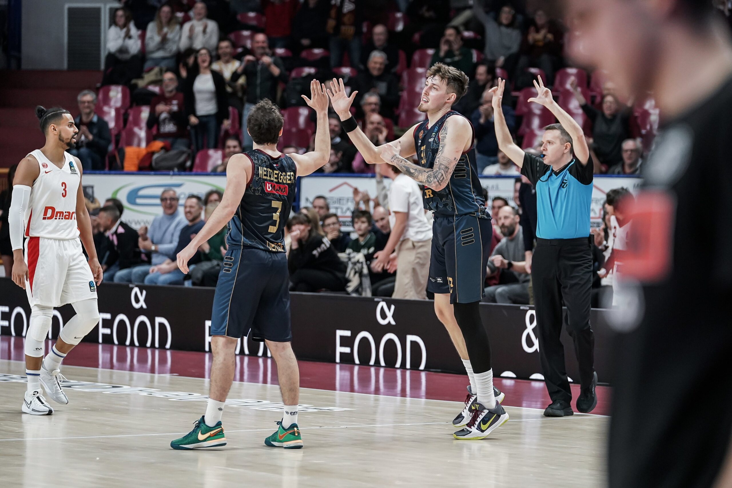 Reyer Venezia: Spissu 9, Tessitori 18 + 12 rim, Heidegger 18, Casarin 3, De Nicolao 3, O’Connell, Janelidze n.e., Brooks 8, Simms 5, Wiltjer 25, Vanin, Tucker 19. Coach: Neven Spahija