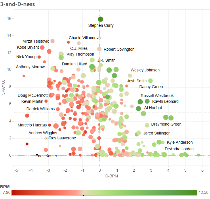 La scorsa stagione infatti 350 giocatori nella lega hanno giocato almeno 500 minuti, di questo gruppo 167 avevano una Plus-Minus difensivo positivo, ovvero un punteggio calcolato in base al loro impatto difensivo su 100 possessi) e 176 avevano una media di almeno 5 triple tentate per 100 possessi. Di questi 350 solo 35 hanno avuto sia un indice Difensivo, Plus-Minus positivo ed hanno tentato di più di 5 triple per 100 possessi.