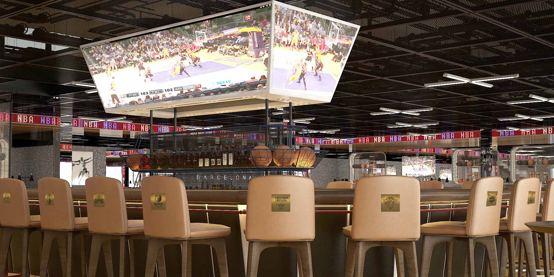 I 1.200 metri quadrati dell’NBA Café di Barcellona saranno caratterizzati da un’infinita serie di immagini, cimeli e merchandising NBA, il tutto impreziosito da un menu che comprenderà cibi di stampo americano, insieme a piatti della cucina mediterranea. Gli schermi presenti, tra cui anche un “jumbotron” di quattro facce, simile a quelli presenti nelle arene, posizionato sopra l’area bar, proporranno gli highlights e la programmazione NBA. Gli appassionati potranno inoltre incontrare, durante i momenti chiave della stagione, giocatori in attività e stelle del passato, mascotte e dance team NBA.