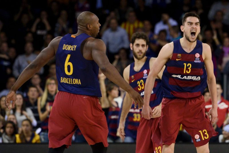 arcelona's Czech guard Tomas Satoransky (R) celebrates after scoring during the Euroleague top 16 group F basketball match FC Barcelona Lassa vs Real Madrid at Palau Blaugrana sportshall in Barcelona on March 17, 2016. / AFP / JOSEP LAGO (Photo credit should read JOSEP LAGO/AFP/Getty Ima