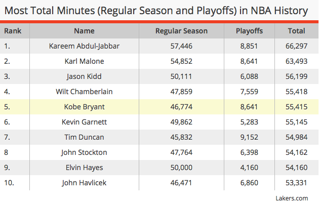 Fisicamente, c’è da chiedersi se Bryant sarà capace di sconfiggere istantaneamente la sua umana mortalità : a parte i suoi recenti infortuni, il numero 24 gialloviola ha appena compiuto 37 anni, ed il suo ruolino di marcia segna già 55.415 minuti in campo (tra regular season e playoffs), numero che lo vede occupare la quinta posizione tra i giocatori che hanno giocato di più nella storia della lega (dietro Abdul-Jabbar, Malone, Kidd e Chamberlain).