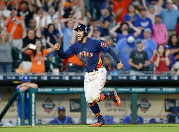 HOUSTON, TX – APRIL 09: George Springer #4 of the Houston Astros scores the winning run in the twelfth inning on an Evan Gattis #11 walk by Matt Strahm #64 of the Kansas City Royals at Minute Maid Park on April 9, 2017 in Houston, Texas. Houston won 5-4. (Photo by Bob Levey/Getty Images)