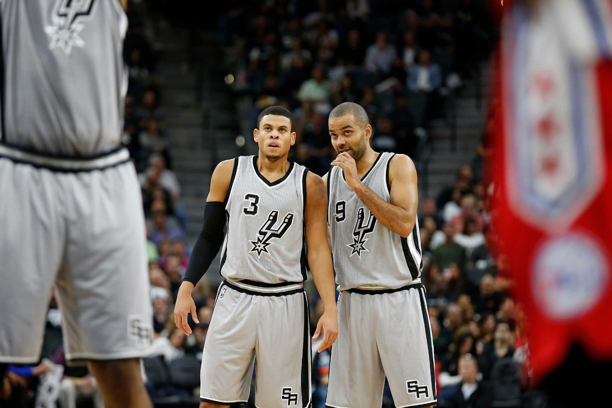 Spurs’ Tony Parker (09) offers guidance to teammate Ray McCallum (03) during the game against the Philadelphia 76ers at the AT&T Center on Saturday, Nov. 14, 2015. (Kin Man Hui/San Antonio Express-News)