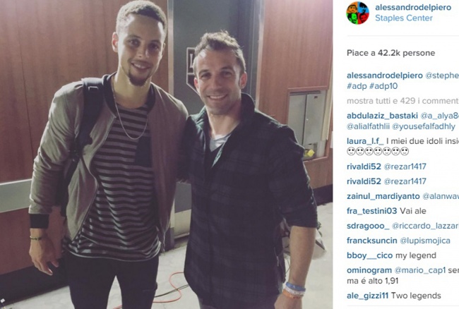 Dopo la partita, che ha visto trionfare a sorpresa la squadra di LA per 112-95, Del Piero ha incontrato Steph Curry, stella dei Warriors e MVP NBA 2015, e ha postato lo scatto sui propri social network.