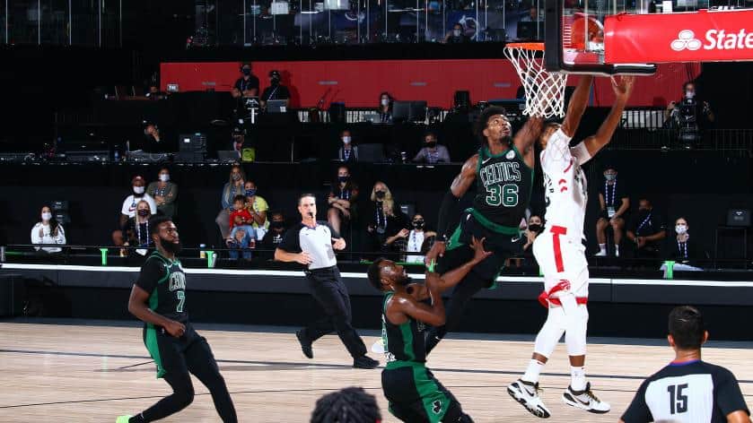 Con 3:50 da giocare, Boston è avanti per 88-80 ma Kyle Lowry e Pascal Siakam riescono a rimettere i Raptors in scia (89-87) ad un minuto dal termine: Siakam stoppa Jayson Tatum sotto canestro, l’eroe di gara 6 Norm Powell recupera il pallone e si lancia in contropiede per i due punti del pareggio ma sulla sua strada trova Marcus Smart, che prende il tempo all’ala dei canadesi e lo stoppa a sua volta, è la giocata più importante della partita per Boston.
