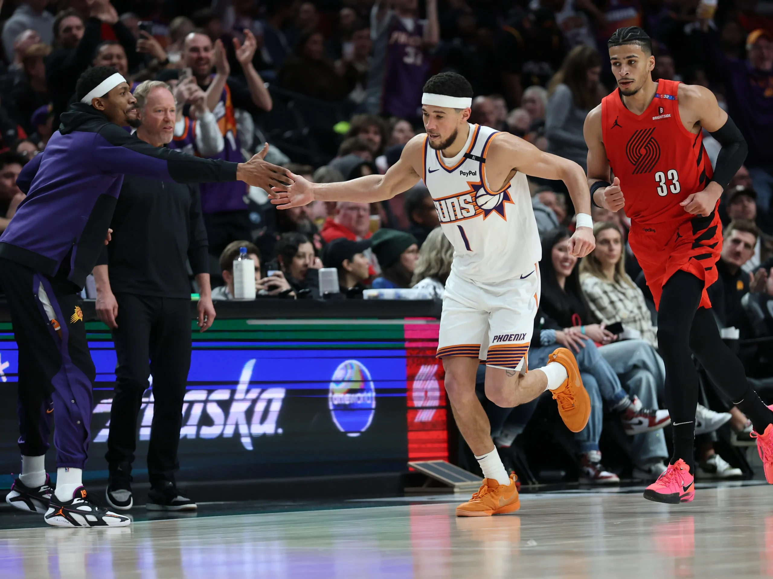 Contro la sua ex squadra, con cui ha giocato nel 2021 le NBA Finals, Deandre Ayton ha chiuso con 25 punti e 20 rimbalzi, per Deni Avdija 24 punti e per Toumani Camara 17 punti. Dalla panchina Scoot Henderson ha segnato 15 punti con 6 assist. E proprio Devin Booker, nonostante il record di franchigia, ha fallito il tiro libero del potenziale pareggio sul 120-120 a 4 secondi dalla fine dopo aver subito un fallo su un tentativo da tre punti da parte di Avdija. Fino a quel momento Booker non aveva ancora sbagliato in lunetta in partita.