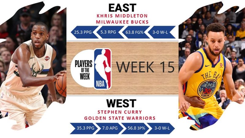 Consueto appuntamento con l’elezione dei giocatori della settimana, anche se stavolta ad Est di consueto non c’è nulla: i riflettori sono tutti per un sorprendente Khris Middleton dei Milwaukee Bucks, solida conferma nonostante la burrasca post-dimissioni di Jason Kidd. Acque più calme ad Ovest, o quantomeno solita vecchia musica: quella della baia di Oakland, con il maestro Stephen Curry a dirigere egregiamente l’orchestra dei Golden State Warriors.