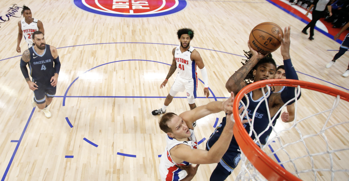 Entrambi, in diverse occasioni, sono stati vittime della difesa di Morant. Che qui stoppa la matricola di Detroit sulla linea da tre punti e conclude con una schiacciata dall’altro lato del campo.