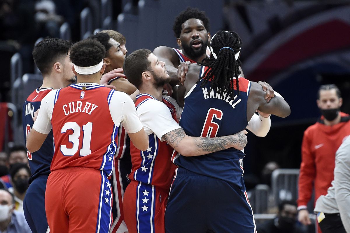 Lo stesso Harrell è stato protagonista di un alterco con Embiid, che è costato al lungo degli Wizards due tecnici e, di conseguenza, l’espulsione dal campo. A 3 minuti dalla fine del terzo quarto, Embiid riceve palla in post e sembra colpire Harrell in faccia con la sua spalla. Harrell va per terra, si rialza immediatamente, e avvolge con forza il lungo dei Sixers durante il movimento di tiro. Tra i due scoppia una lite che viene sedata con un doppio fallo tecnico e l’intervento di compagni e staff delle due squadre.