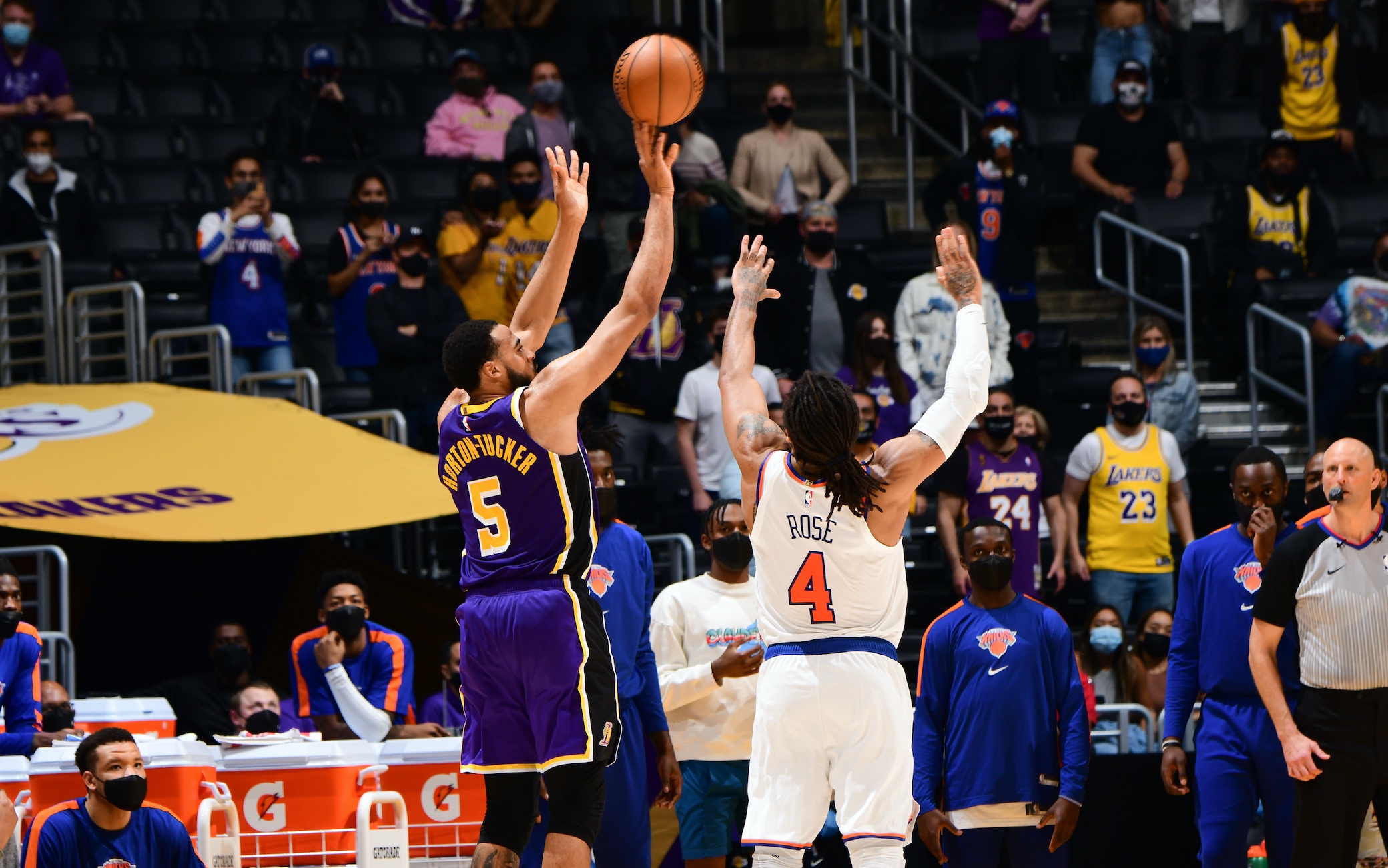 Una tripla di Talen Horton-Tucker a 20 secondi dallo scadere del primo tempo supplementare chiude la partita sol 101-99 Lakers, alla fine dei primi 48 minuti era stato un canestro di Wesley Matthews a salvare i padroni di casa da una sconfitta che avrebbe significato play-in assicurati. Contro i Knicks, una delle migliori difese del campionato NBA, i gialloviola ritrovano Kyle Kuzma e giocano una partita corale.