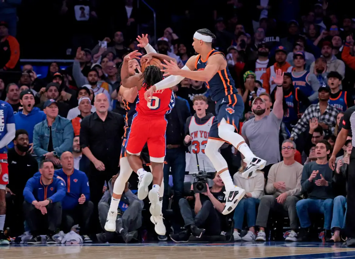 I Sixers hanno perso gara 2 per 104-101, una partita decisa da una tripla di Donte DiVincenzo a 13 secondi dalla fine e che Philadelphia conduceva per 101-96 a 30 secondi dal termine. DiVincenzo ha convertito il terzo extra possesso Knicks di fila in una sequenza caotica nel finale, con una palla persa di Tyrese Maxey forse viziata da un fallo di Jalen Brunson e Josh Hart.