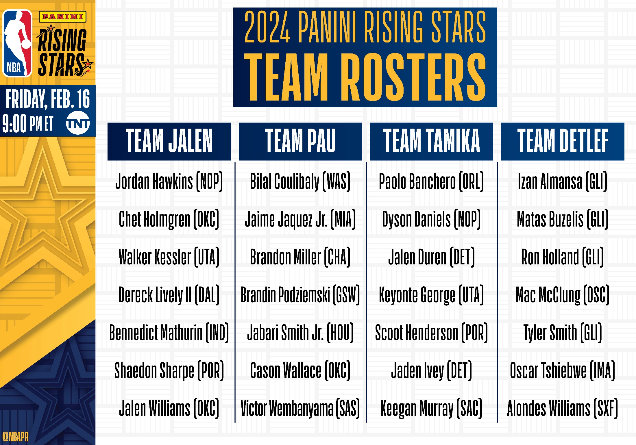 Jalen Rose, Pau Gasol e Tamika Catchings hanno selezionato le proprie squadre per il Panini Rising Stars 2024. Ciascuna leggenda ha potuto scegliere sette giocatori tra i 21 rookie e sophomore dell’NBA.