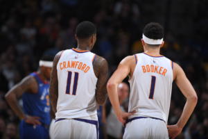 Jamaal Crawford e Devin Booker, rispettivamente ai Suns dal 2018 e dal 2016 Copyright Notice: Copyright 2019 NBAE (Photo by Garrett Ellwood/NBAE via Getty Images)