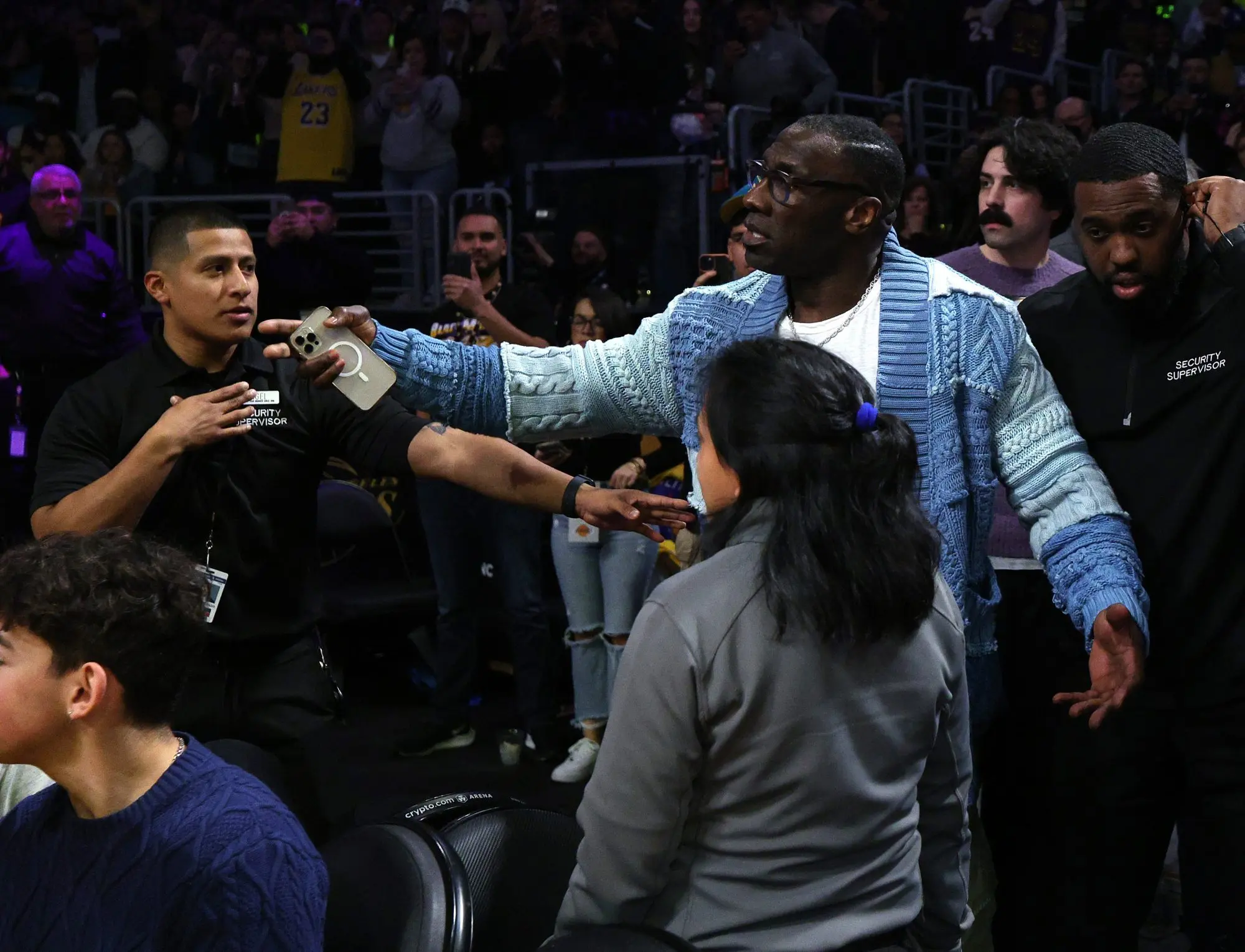 Shannon Sharpe è stato allontanato per qualche minuto dalla security per calmarsi, e ha poi ripreso il suo posto a sedere alla ripresa della partita nel terzo quarto.