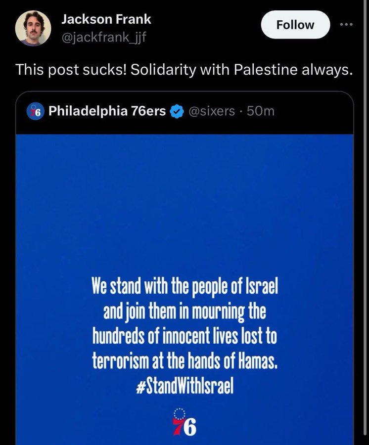 I Sixers avevano diffuso sui loro social un messaggio: “Siamo al fianco del popolo d’Israele e ci uniamo a loro nel cordoglio per la perdita di centinaia di vite innocenti, cadute per mano dei terroristi di Hamas“, con l’hastag #StandWithIsrael. Post che Jackson Frank ha rilanciato commentando: “Questo post fa orrore! Solidarietà alla Palestina, sempre“.