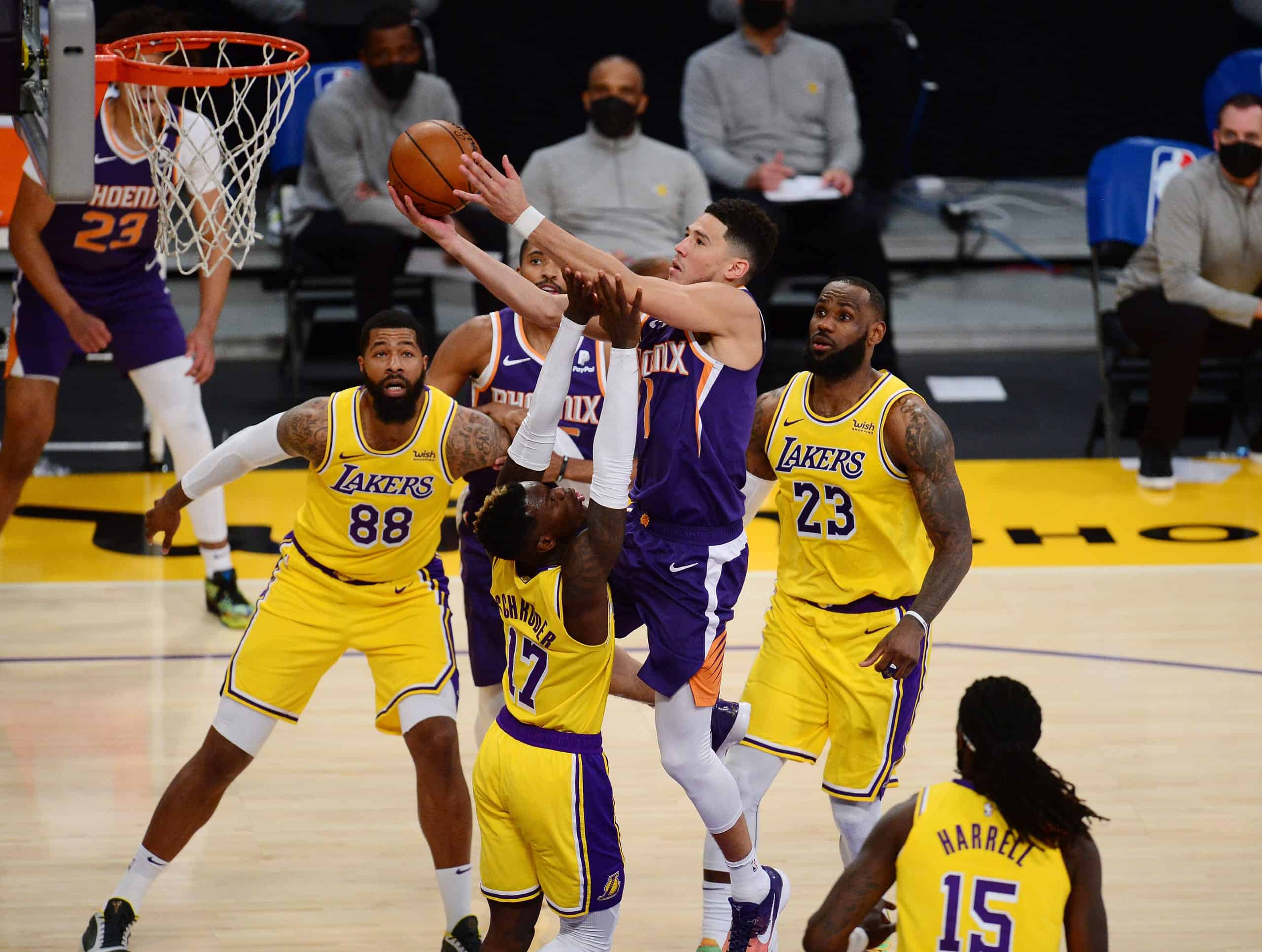 Dal canto loro Devin Booker e compagni dovranno far circolare il pallone e cercare di punire gli aiuti sulle penetrazioni con degli scarichi sugli angoli da cui, numeri alla mano, sanno far male: il quantitativo arriva al 43.8% (4.2 canestri su 9.6 tentativi), inferiore solo a quello dei Los Angeles Clippers. Mano calda e nervi saldi serviranno ai tiratori che avranno poco margine d’errore di fronte ad una delle migliori difese della lega, brava a sporcare le linee di passaggio ed aggredire il portatore di palla con continui cambi o raddoppi. Inoltre la capacità di saper presidiare l’area dei Lakers potrebbe essere un problema quando i Suns andranno ad utilizzzare il mid-range shooting, tra le armi preferite di Paul e Booker (in totale la squadra tocca il 47.4%). Gli isolamenti rimangono un’opzione a cui affidarsi specialmente quando l’attacco risulterà stagnante, i pick and roll potranno rappresentare un mezzo per costringere a muovere le pedine sulla scacchiera, così come i blocchi lontano dalla palla utili a liberare Booker, alla sua prima esperienza ai playoffs e da cui ci si aspetta molto.