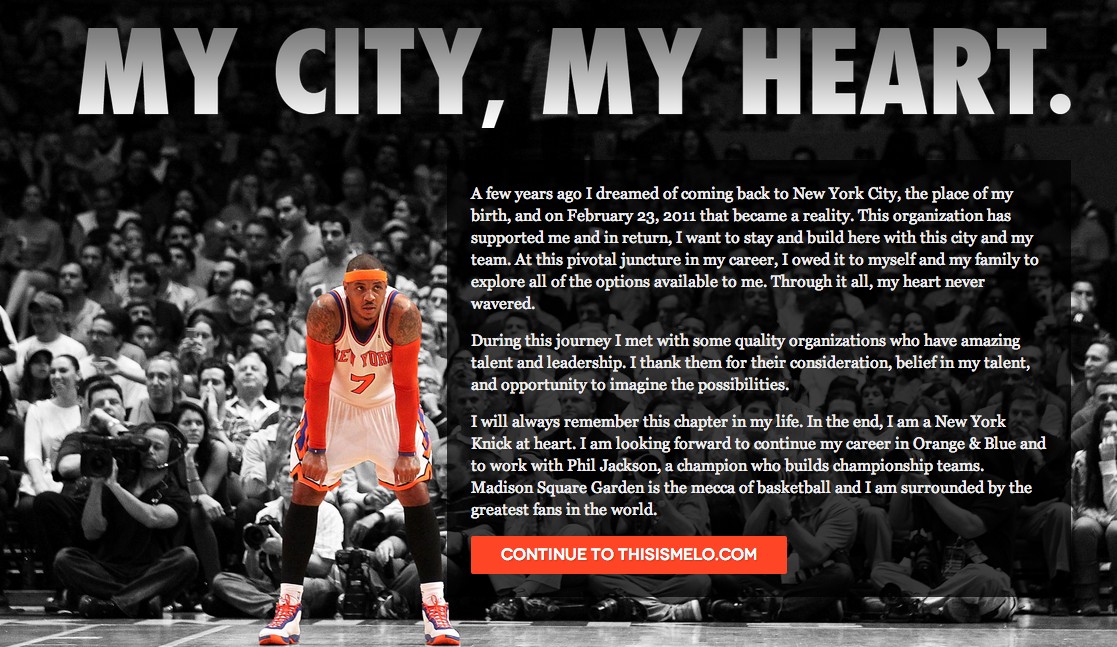Attraverso il suo sito thisismelo.com, Carmelo Anthon ha confermato il suo rinnovo al massimo salariale con i New York Knicks. Ecco quanto scritto dal giocatore della Big Apple: