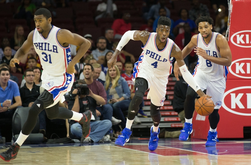 Oct 8, 2015; Philadelphia, PA, USA; Philadelphia 76ers center Nerlens Noel (4) brings the ball up court with center Jahlil Okafor (8) and guard Hollis Thompson (31) during the second half against the Cleveland Cavaliers at Wells Fargo Center. The 76ers won 115-114. Mandatory Credit: Bill Streicher-USA TODAY Sports