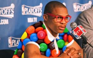 Non è la prima volta che Mr. Why Not indossa look abbastanza eccentrici, come ad esempio dopo una Gara-2 dei playoff, quando si è presentato in conferenza stampa con una maglietta letteralmente squarciata sul ventre. Questa stravaganza è valsa a Russ alcune apparizioni ad importanti eventi di moda come la scorsa estate alla Fashion Week di Milano. Oppure possiamo ricordarci della volta che invece in conferenza stampa andò con una shirt degli M&M’s.