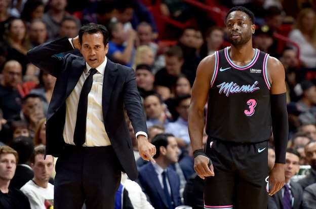 Coach Erik Spoelstra e Dwyane Wade. Per il numero 3, il 2018/19 è stata la stagione d’addio
