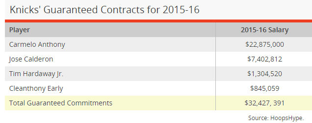 Come appare chiaro dal grafico di Bleacher report, i Knicks nella prossima stagione avranno soltanto 4 contratti garantiti per un totale di 32.4 milioni di dollari.
